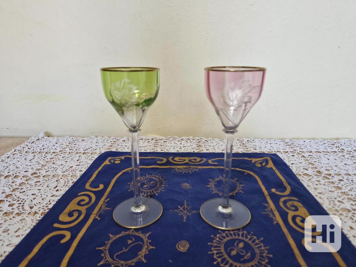 Krásné barevné secesní sklenice na nožce, kvalitní řezba s motivem květiny, Moser Karlsbad.