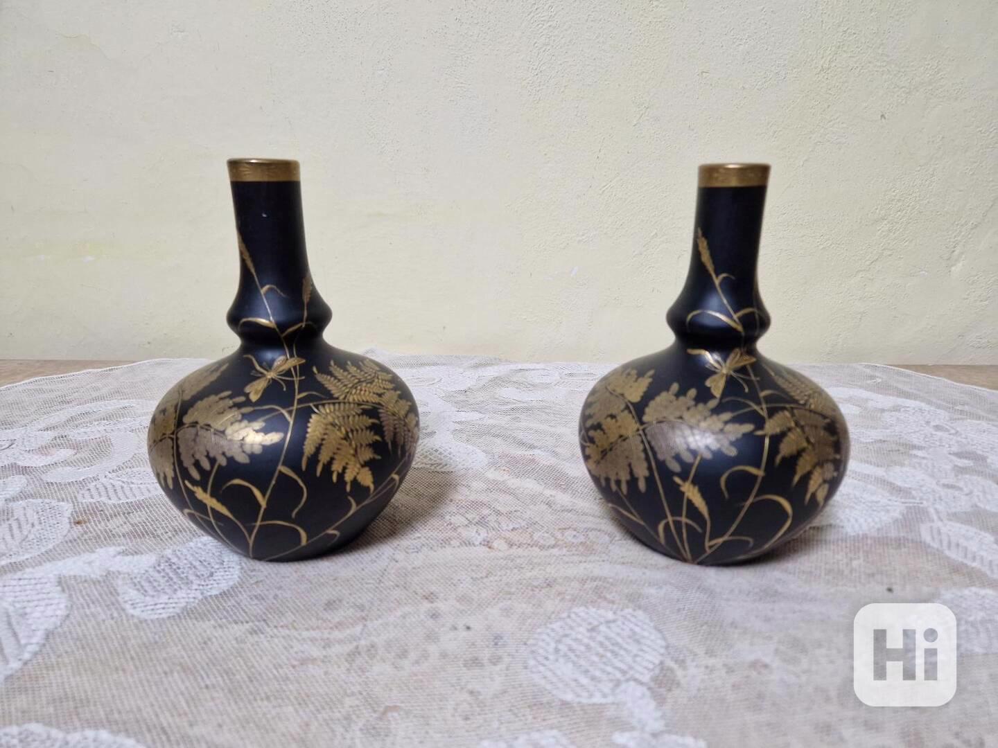 Krásné párové vázy, černé sklo bohatě zdobené zlatem, hmyz vážky? - Josef Riedel, značeno, konec 19 stol.