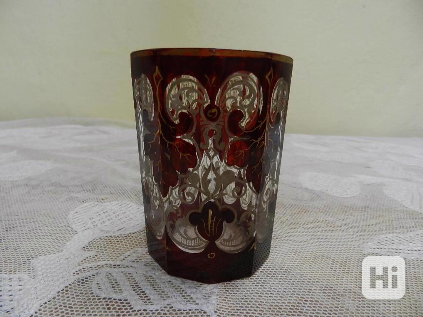 Hezká desetiboká zlacená Sklenice, rubínová lazura - Čechy, 2 pol. 19 stol.