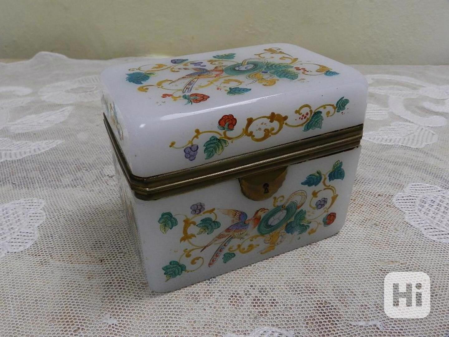 Krásná masivní Dóza s pantem, Biedermeier, malované alabastrové sklo, motivy 5 různých ptáků - kolem 1850, Harrachov.