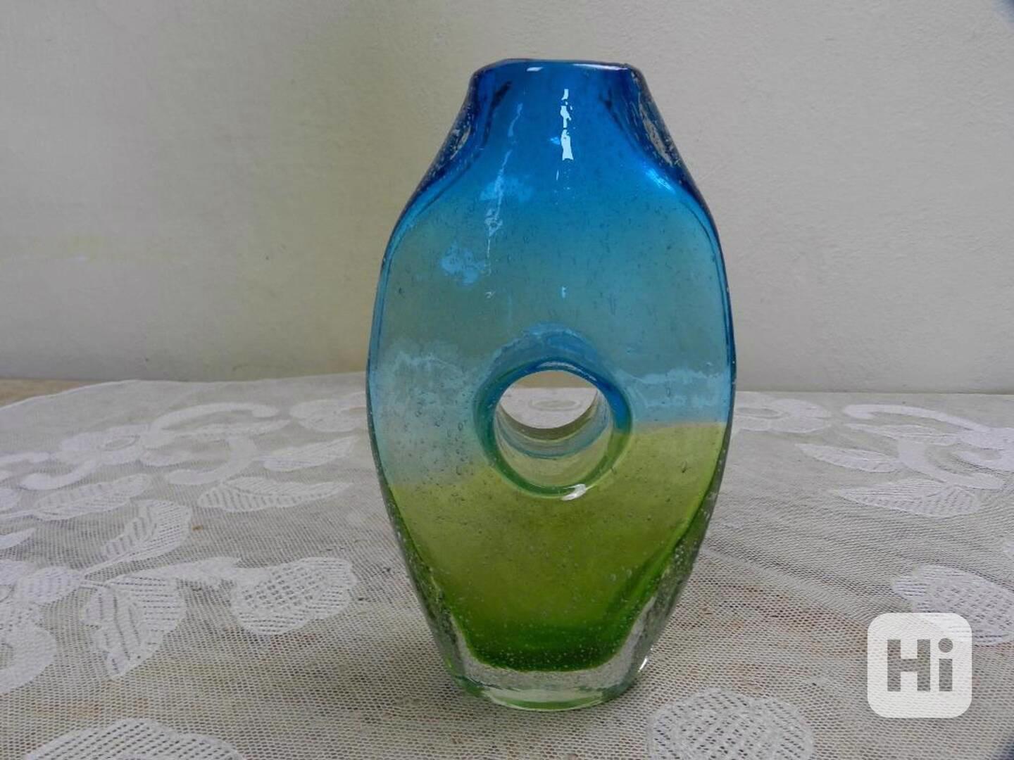 Zajímavá autorská modro zelená Váza, hutní sklo -Čechy, 2 pol. 20 stol.