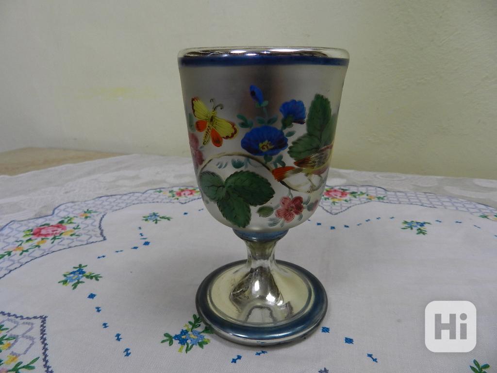 Krásný velmi starý malovaný amalgámový Pohár, motivy květin, motýlů a ptáčků - Harrachov.Rozměry: výška 14,5cm, průměr 8cm, hmotnost cca 160g.
