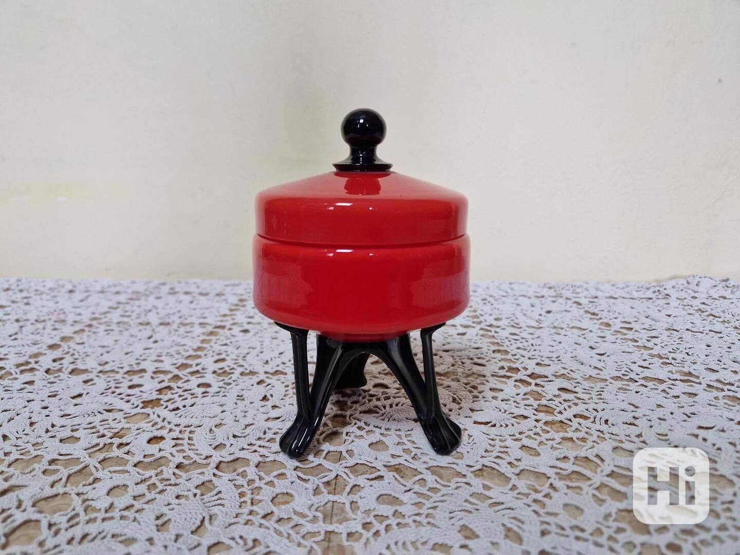 Krásná větší oranžovo-černá Dóza, Tango sklo - pravděpodobně Čechy, 1 třetina 20 stol.Rozměry: výška 16cm, šířka 10,5cm.