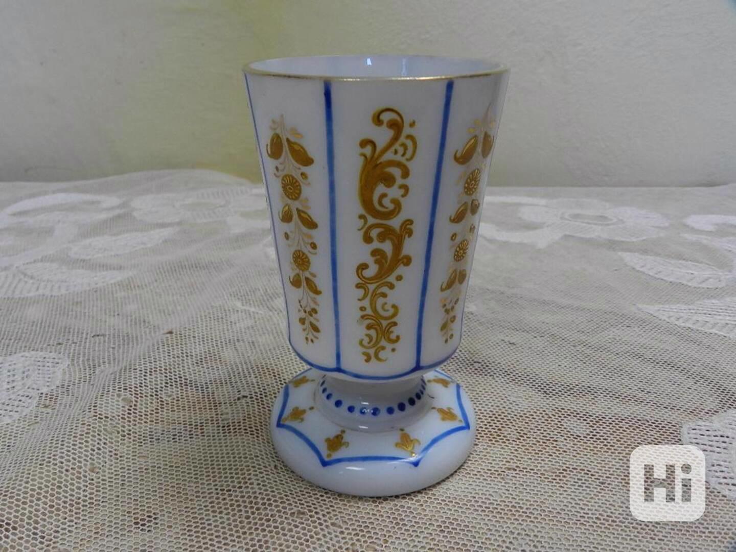 Zajímavá mléčná ručně zdobená zlacená sklenice - Čechy, 19 stol.