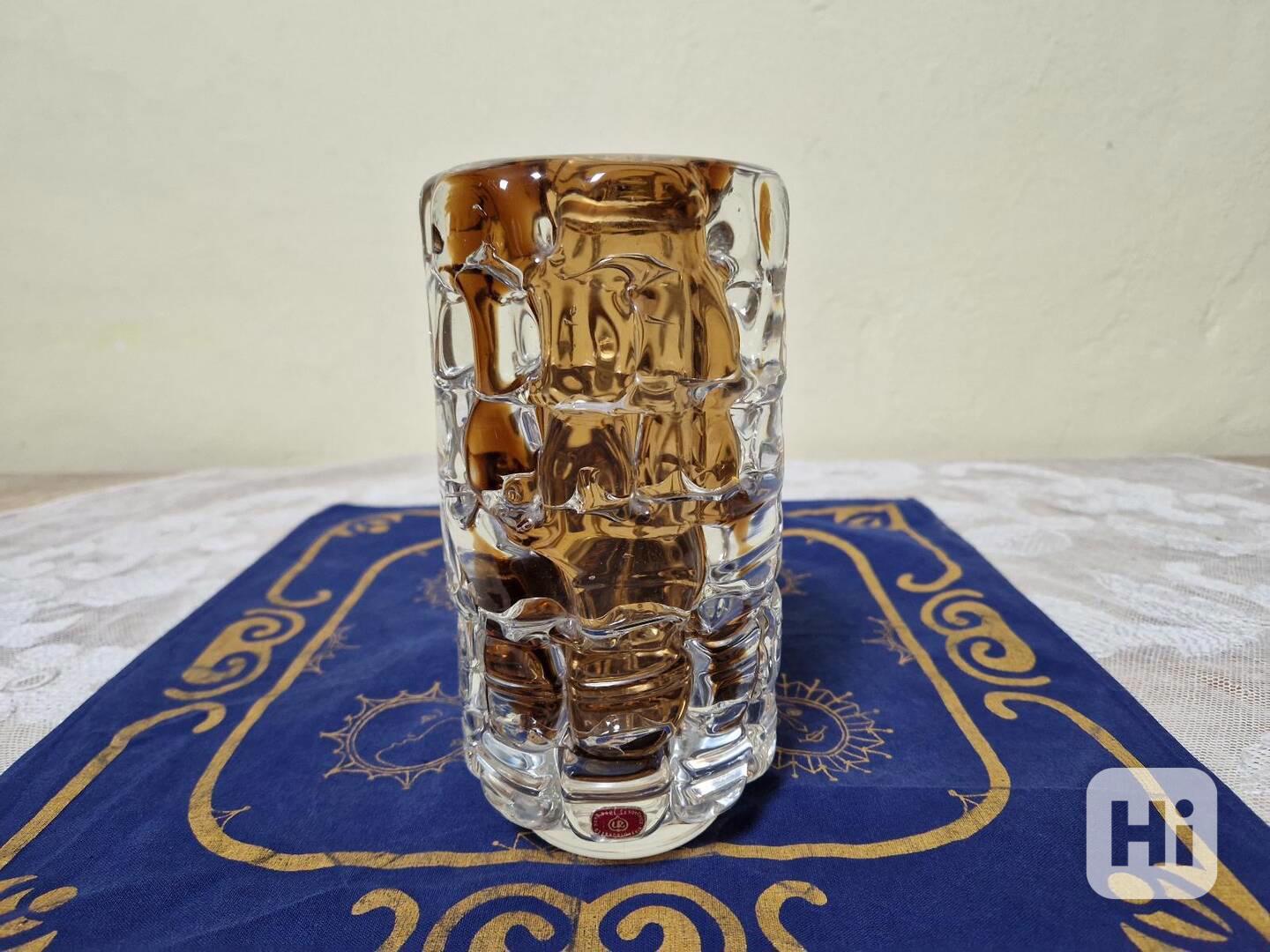 Váza, čiré a hnědé hutně zpracované sklo, plastický reliéf - František Vízner, Škrdlovice, značeno etiketkou,1968.