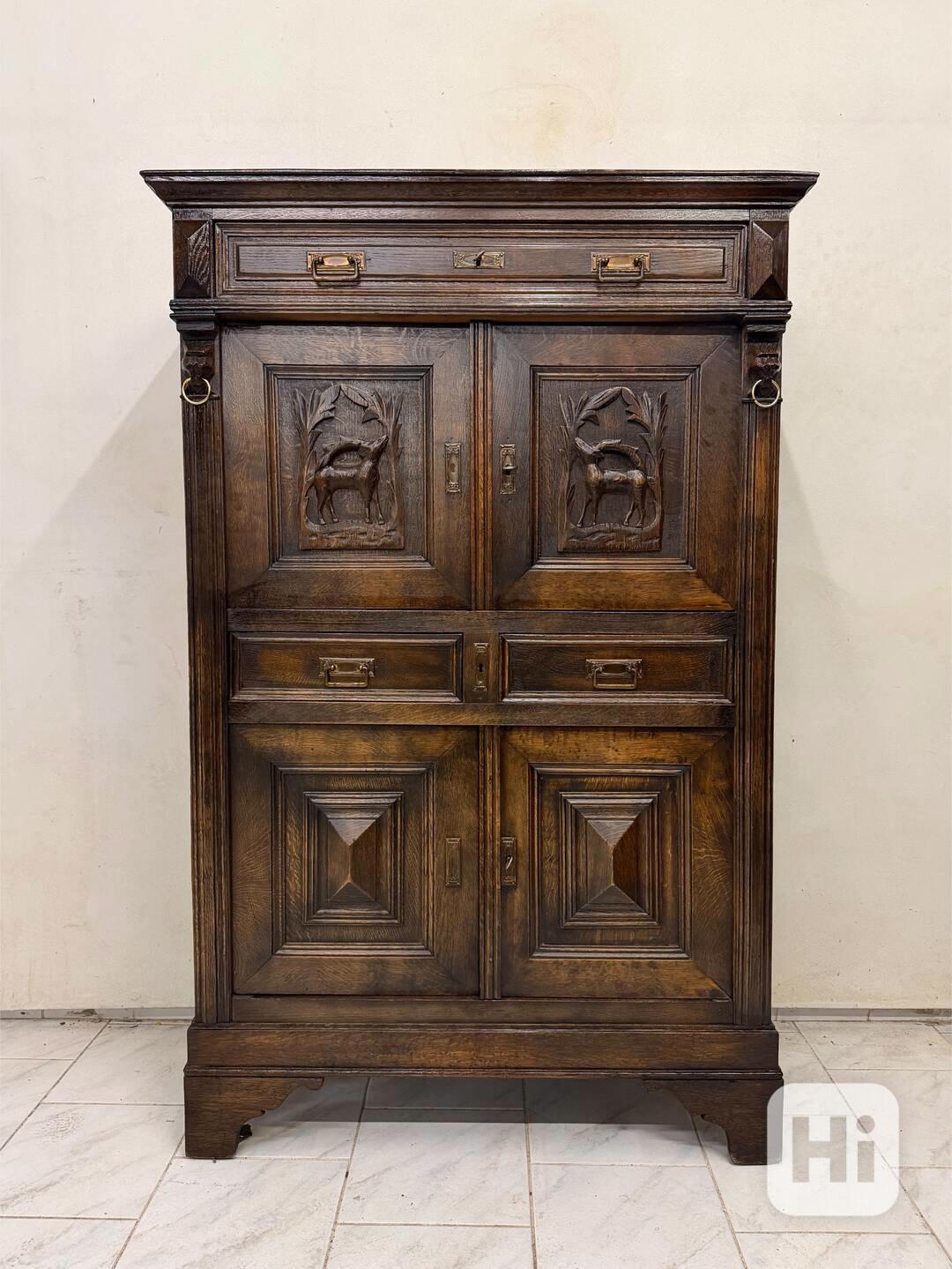 Starožitná masivní skříň Mechelen ● spousta úložného prostoru ● řezby typické pro Mechelen nábytek ● lví hlavy s kroužky ● původ Belgie ● období historismus – vyrobena cca 1910