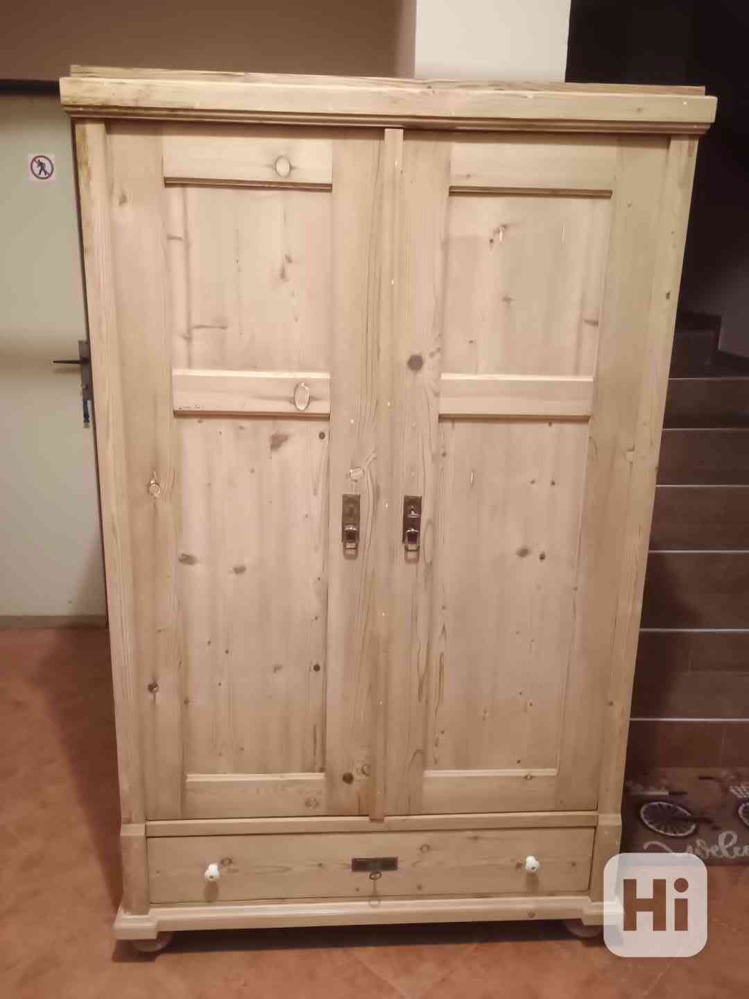 stará smrkovka po komplet renovaci, louhovaná, broušená, bez povrchové úpravy, po dohodě možno olejem Adler Legno nebo voskem, cena + cca 10%, šuple ,police, ramínková tyč, věšáky, šuple i dveře zamykatelné, rozměry: v - 173 cm, š - 107 cm, hl - 51 cm, vhodná na chalupu nebo starý penzion, pro info volat 603210073