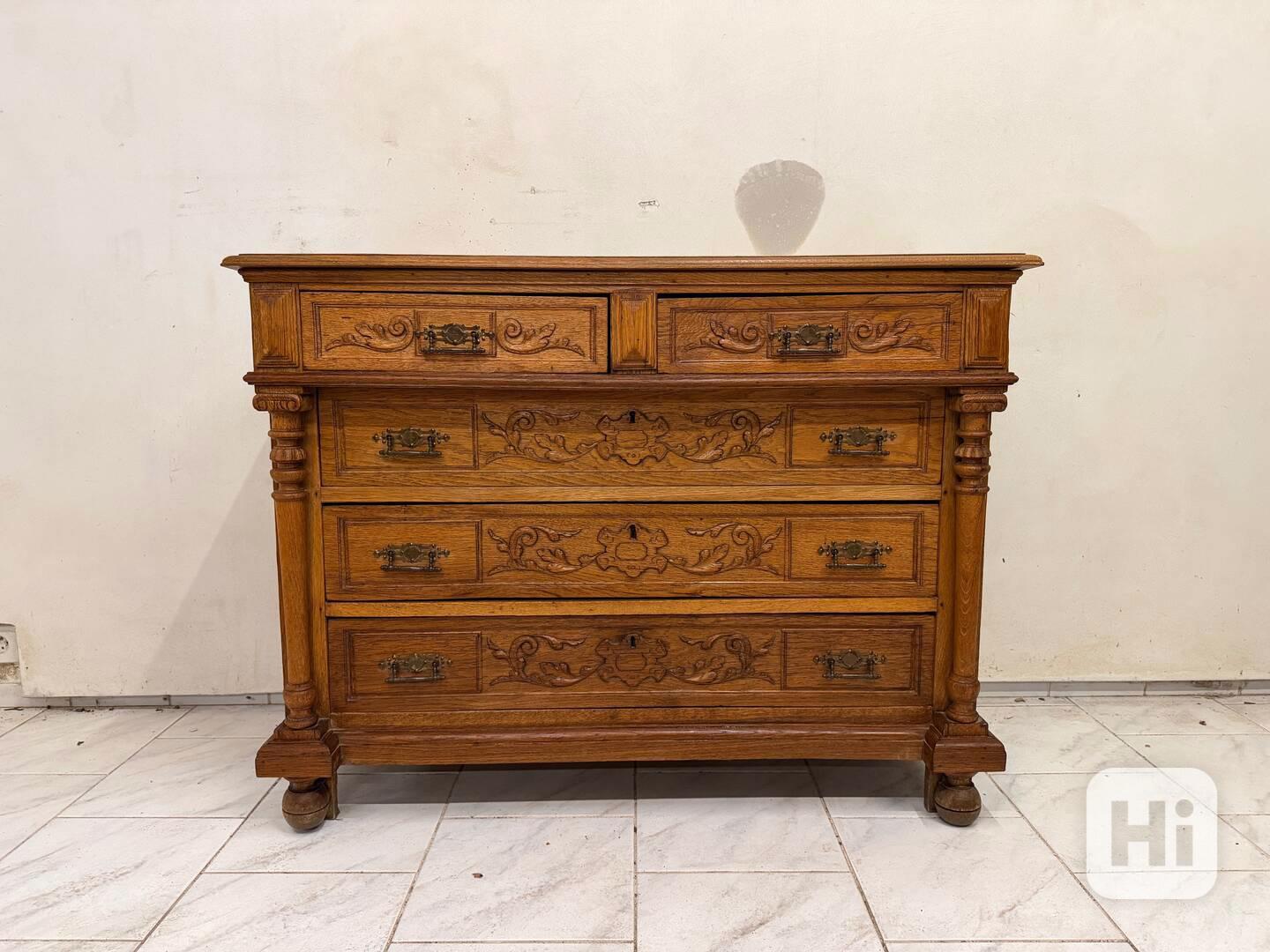 Starožitná masivní komoda Henri II. ● dubové dřevo ● neorenesanční styl ● mosazné kování ● vyřezávané sloupy ● původ Francie ● období historimus ● +- 1900