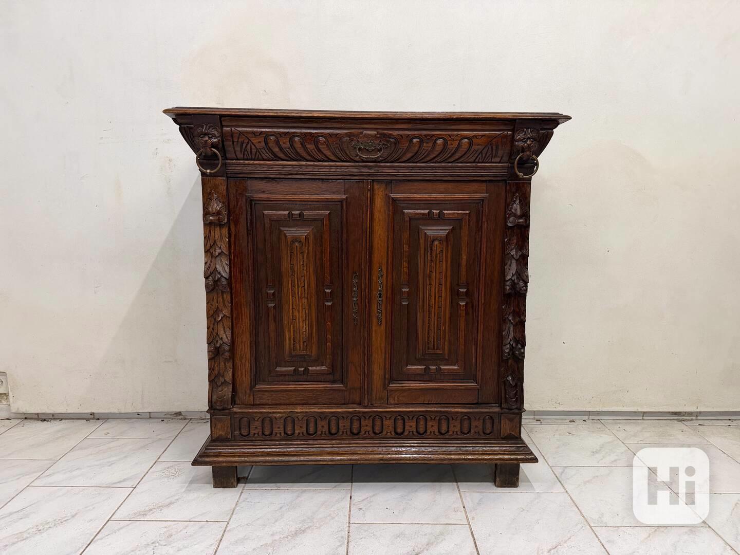 Starožitná masivní skříň Mechelen ● řezby typické pro Mechelen nábytek ● lví hlavy s kroužky ● původ Belgie ● období historismus – vyrobena cca 1910 ● zachovalý, předrenovační stav