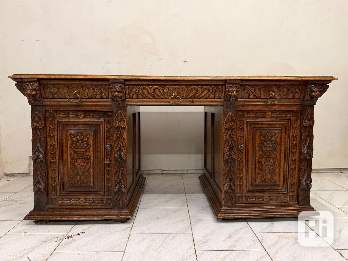 Starožitný pracovní stůl Mechelen ● dubové dřevo ● bohatě zdobený ● stabilní ● historické řezby ● neorenesanční styl ● mosazné kování ● lví hlavy – typické pro mechelen styl ● původ Belgie ● období historimus ● +- 1900 ● 1x klíč ● rozložitelný na 3 části - snadný transport