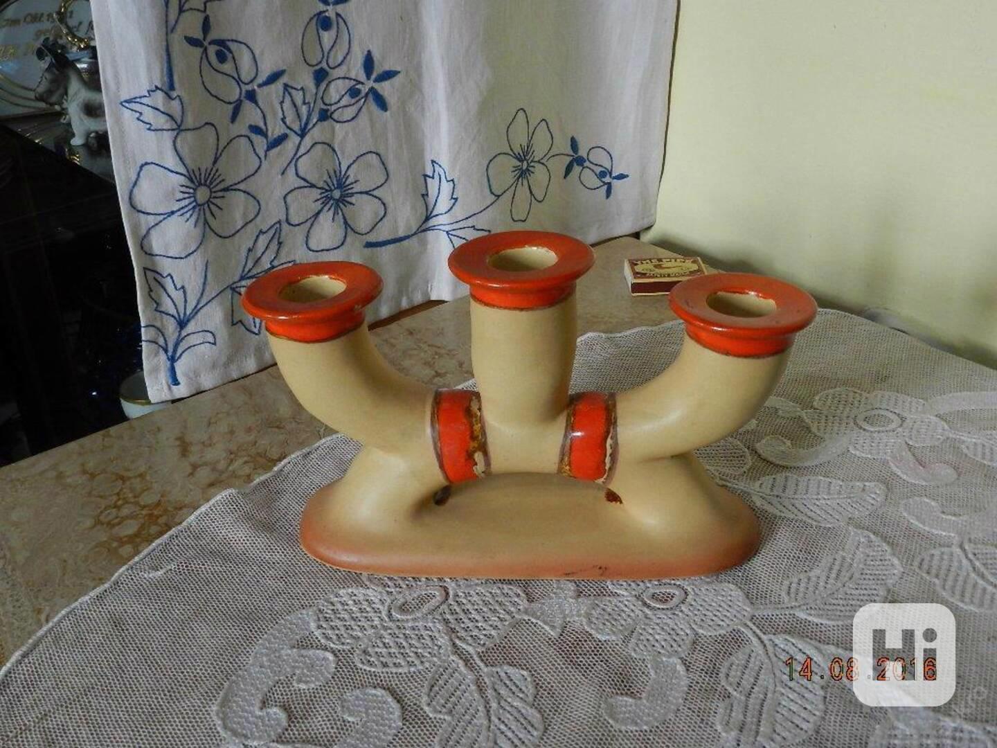 Hezký keramický svícen - Německo.Rozměry: výška 14,5cm, šířka 25cm, hloubka 8,5cm, váha 750g.