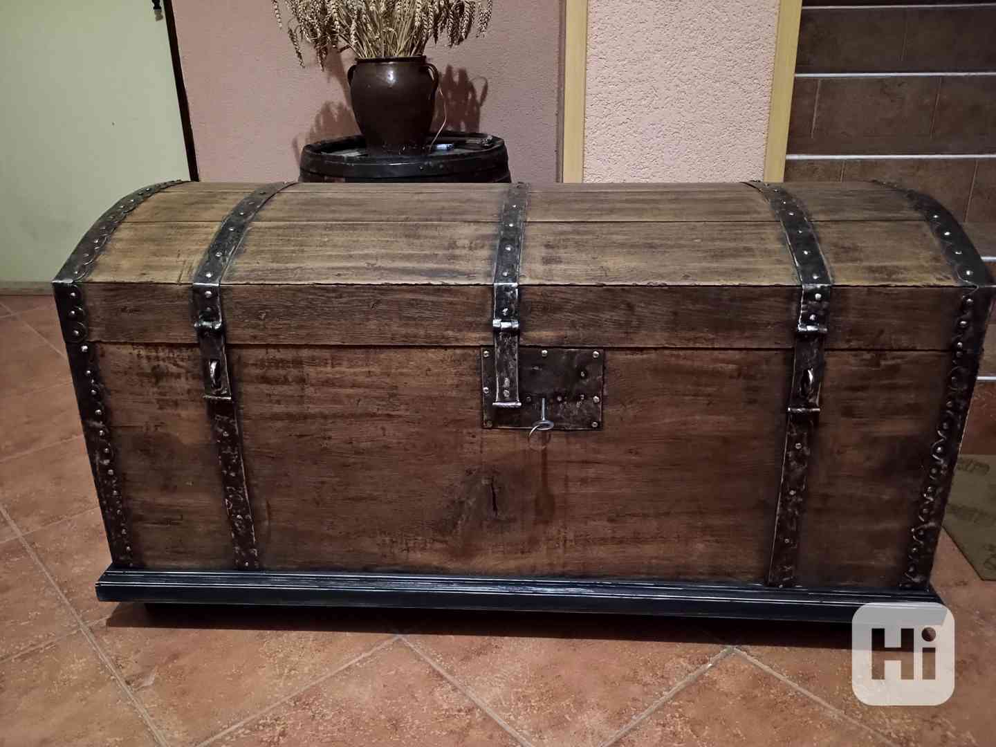 stará dubová zámecká truhla, kovaná pokladnice, vyjímečná kovářská práce s originál barokním zámkem ve funkčním stavu, zamykatelná, po kompletní renovaci, pro sběratele, rozměry: v - 60cm, š - 115 cm, hl - 54 cm, vhodná na starou chalupu nebo stylový penzion, pro info volat 603210073