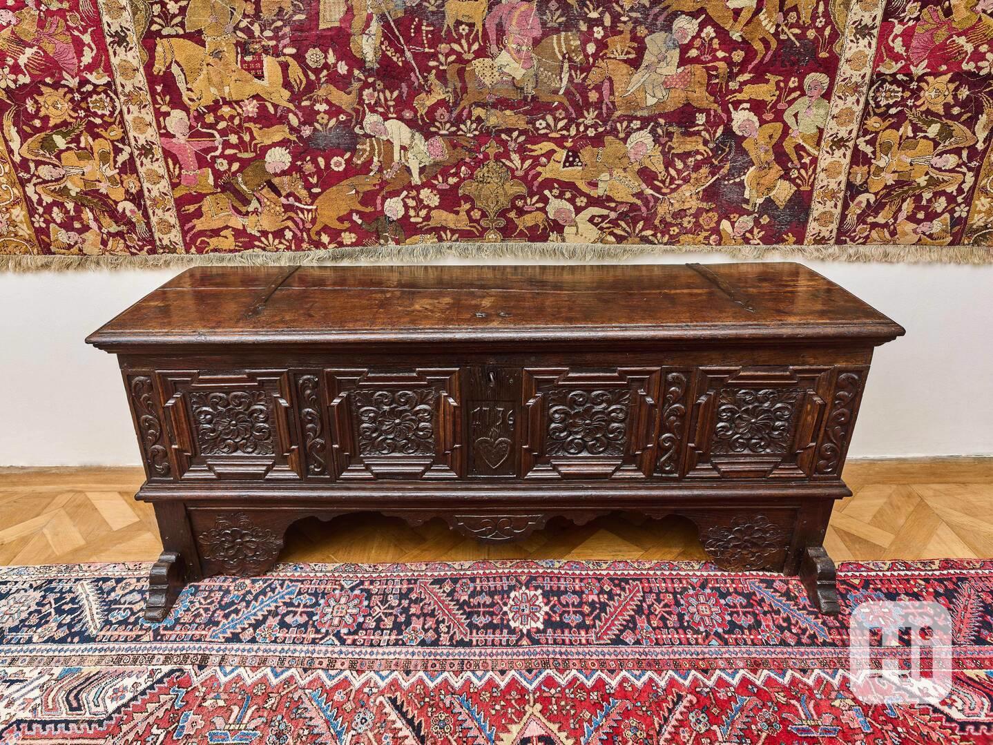 Masivní německá dubová truhla pocházející z oblasti Westfálska, datovaná rokem 1736. Jedná se o výrazný kus raně osmnáctého století s tmavou historickou patinou a bohatě řezbovanými panely v typickém západoněmeckém barokně-lidovém stylu. Přední strana je členěna do několika rámovaných polí zdobených plastickými florálními motivy. Ve středové desce je vyřezané srdce a datace 1736, která potvrzuje původ a stáří.