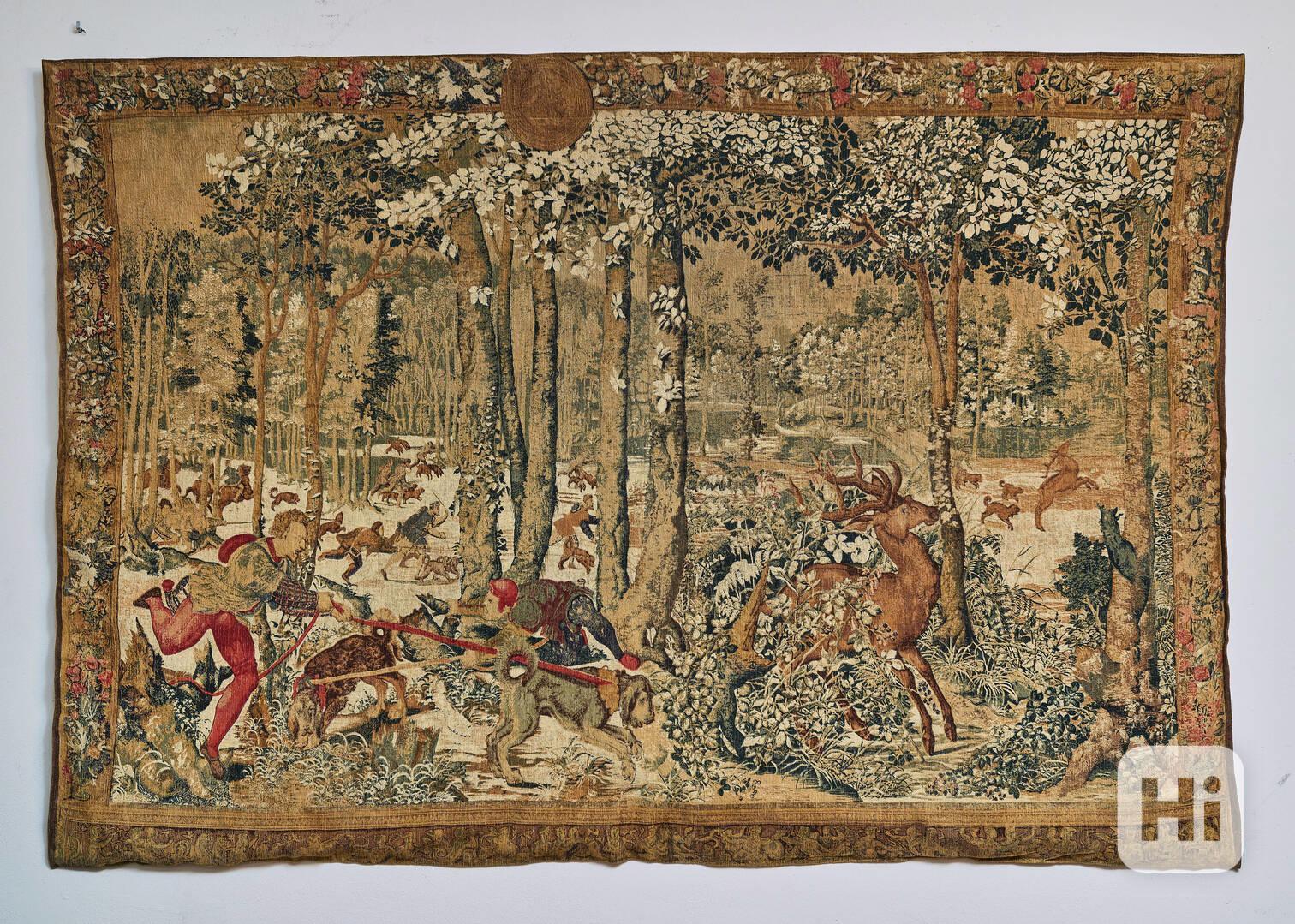 Francouzská ručně tištěná tapiserie s loveckým motivem Chasse de Maximilien představuje dynamický dvorský hon v lesní krajině. Scéna zachycuje okamžik pronásledování jelena smečkou loveckých psů a pěšími lovci. Kompozice je vytvořena s důrazem na pohyb, rytmus a napětí, typické pro aristokratické lovecké výjevy raného novověku. Jelen v centru děje je zobrazen v okamžiku úniku, s napjatým tělem a otočenou hlavou, což umocňuje dramatický účinek celé scény.
