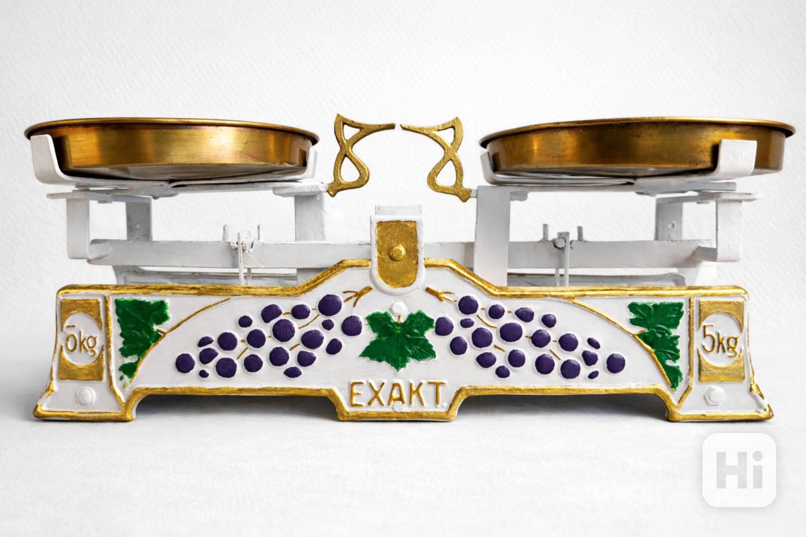 Nabízím krásné historické dvoumiskové váhy značky EXAKT, zdobené motivem vinné révy, které prošly citlivou a pečlivou renovací. Jedná se o mimořádně dekorativní a zároveň sběratelsky hodnotný kus s výrazným charakterem starých časů.