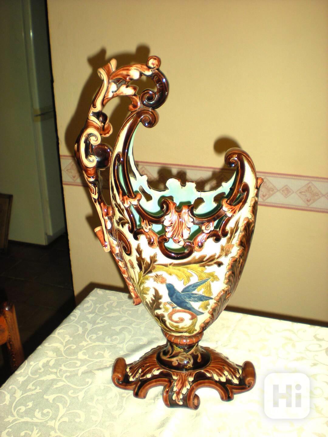 Nabízím dekorativní vázu, majoliková žardiniéra s prolamovaným okrajem a je zdobená reliéfními prvky, včetně listových motivů a ptáka v modré barvě. Vnitřní část je modrozelená. Žardiniéra je velká dekorativní nádoba, určená k pěstování rostlin nebo uchovávání květin.