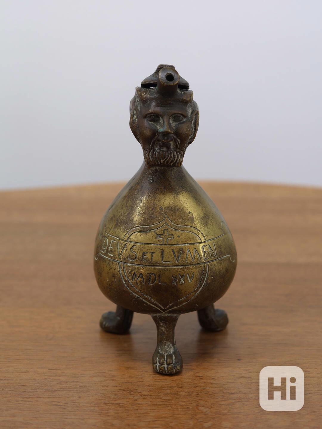 Výjimečný litý bronzový pichet (džbánek / konvička nejčastěji používaná na víno) na třech nožkách, tvarovaný do podoby stylizované lidské postavy. Tělo nádoby je kulovité, nesené na třech zoomorfních či antropomorfních nohách, hrdlo je zakončeno plasticky ztvárněnou hlavou vousatého muže, která zároveň tvoří výlevku. Otevírací víčko je uchyceno kloubem a doplněno jednoduchým držadlem, typickým pro raně novověké kovové nádoby.