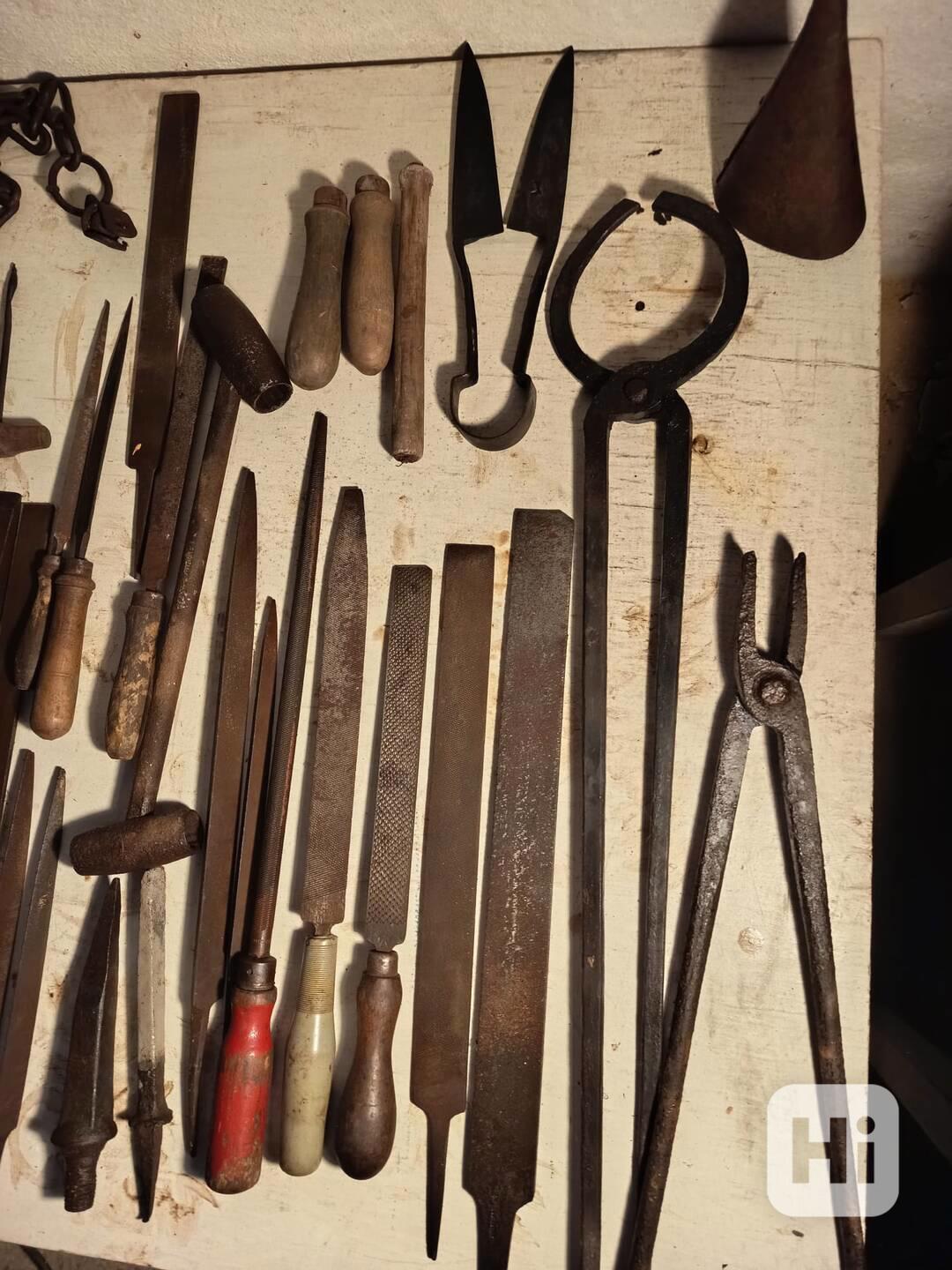 Soubor starožitného nářadí - kovářské kleště, hoblíky, velké množství pilníku, dláta, řetězy na zapřahání hospodářských zvířat, sekera a jiné.