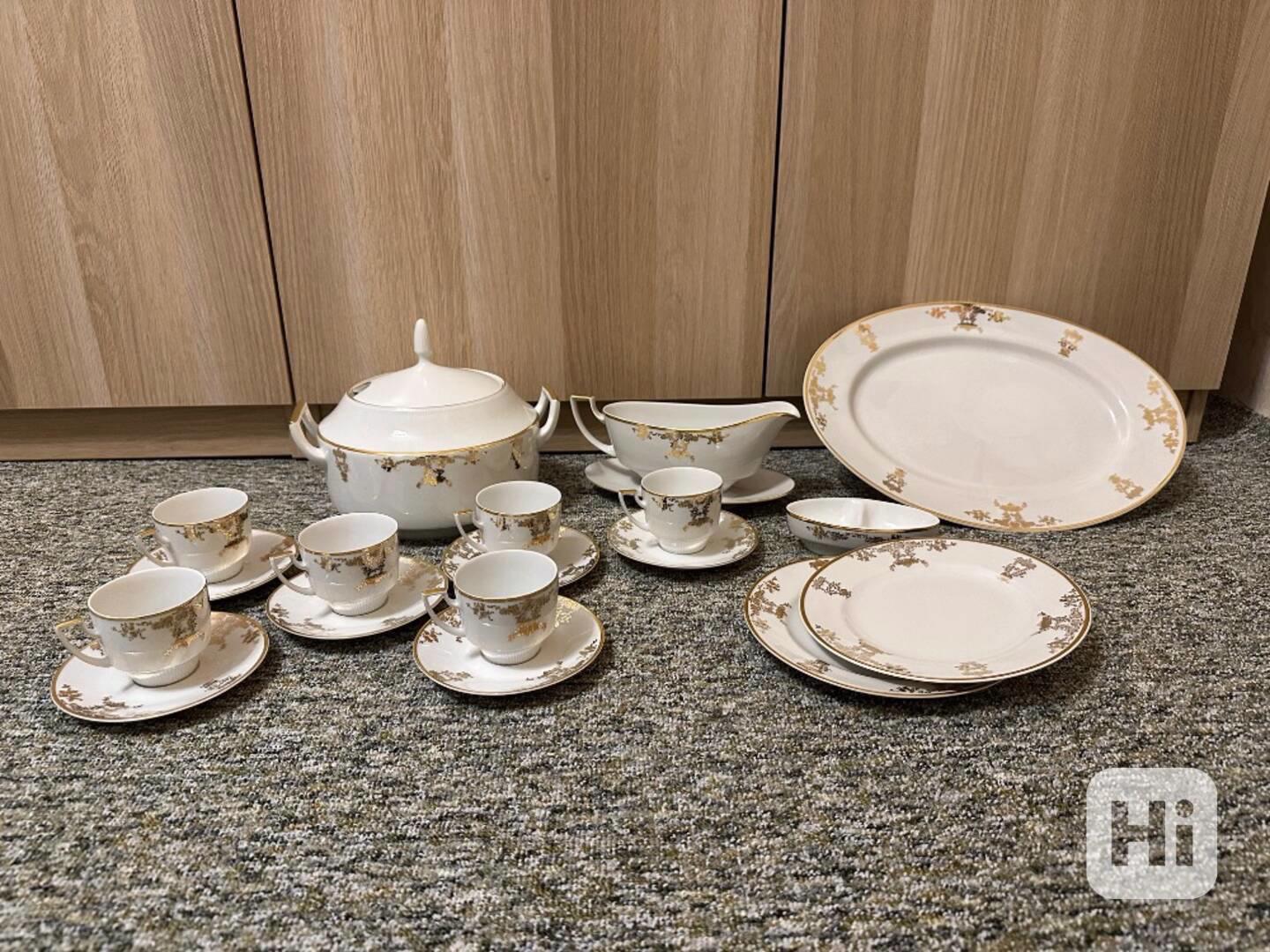 Prodam sadu nadobi z porcelanky Brezova Pirkenhammer. Vse ve velmi dobrem stavu, nepouzivano - pouze bylo vystaveno ve vitrine. Jedna se o: terina na polevku, velky servirovaci talir, omacnik, 2ks dezertnich talirku, solnicka s peprenkou, 6ks salku s podsalky.