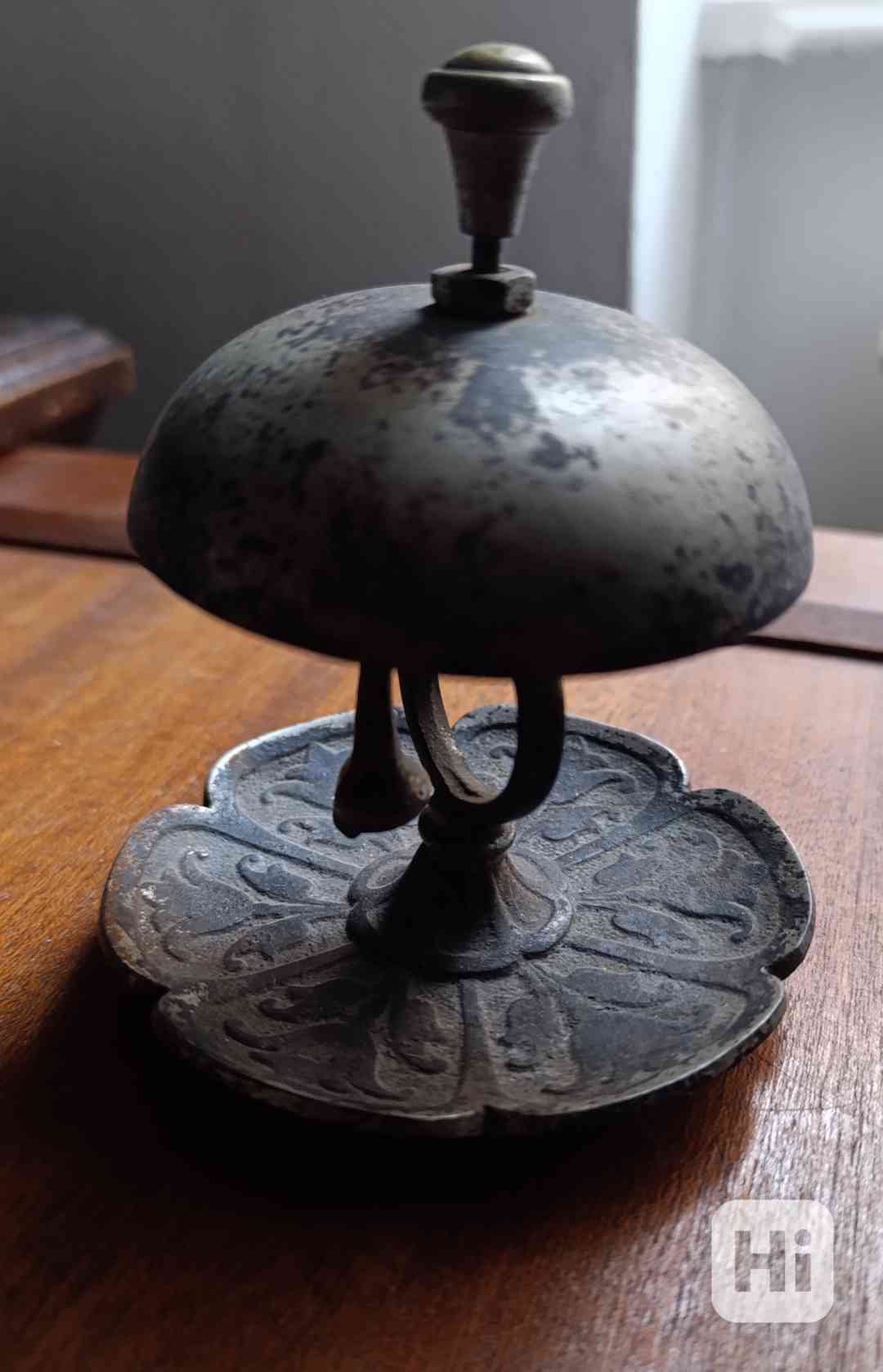 Prodám starožitný zdobený hotelový recepční zvonek úhozový, původní kus, který býval pochromovaný, doposud nerestaurovaný, avšak stále funkční. Materiál litina, mosaz. Rozměry: výška 10 cm, šířka základny - 10 cm. Rarita! Osobní předání na Praze 3, nebo odeslání přes Balíkovnu či Zásilkovnu. Volejte 770 630 523, nebo pište na morgiana007@gmail.com