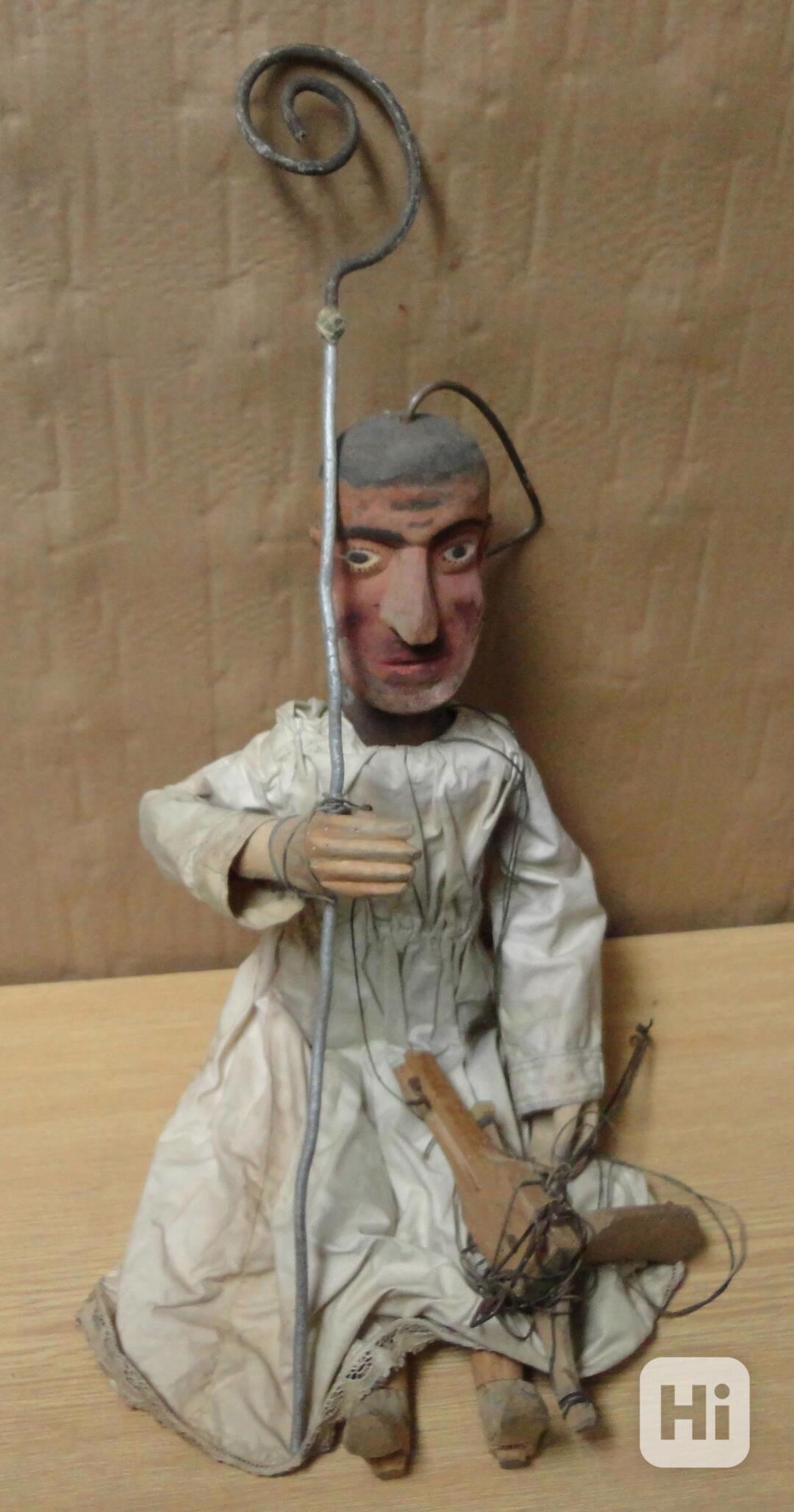 Přes 100 let stará vyřezávaná loutka, vysoká 60 cm, kompletní, s ovládáním a původním oděvem, dobrý původní stav. Kontakt na : antstanek@email.cz