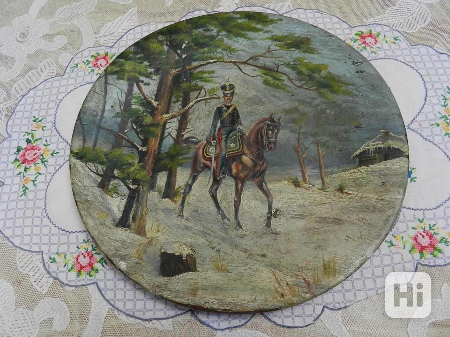 Zajímavý starý malovaný Talíř Důstojník Voják na Koni Rusko