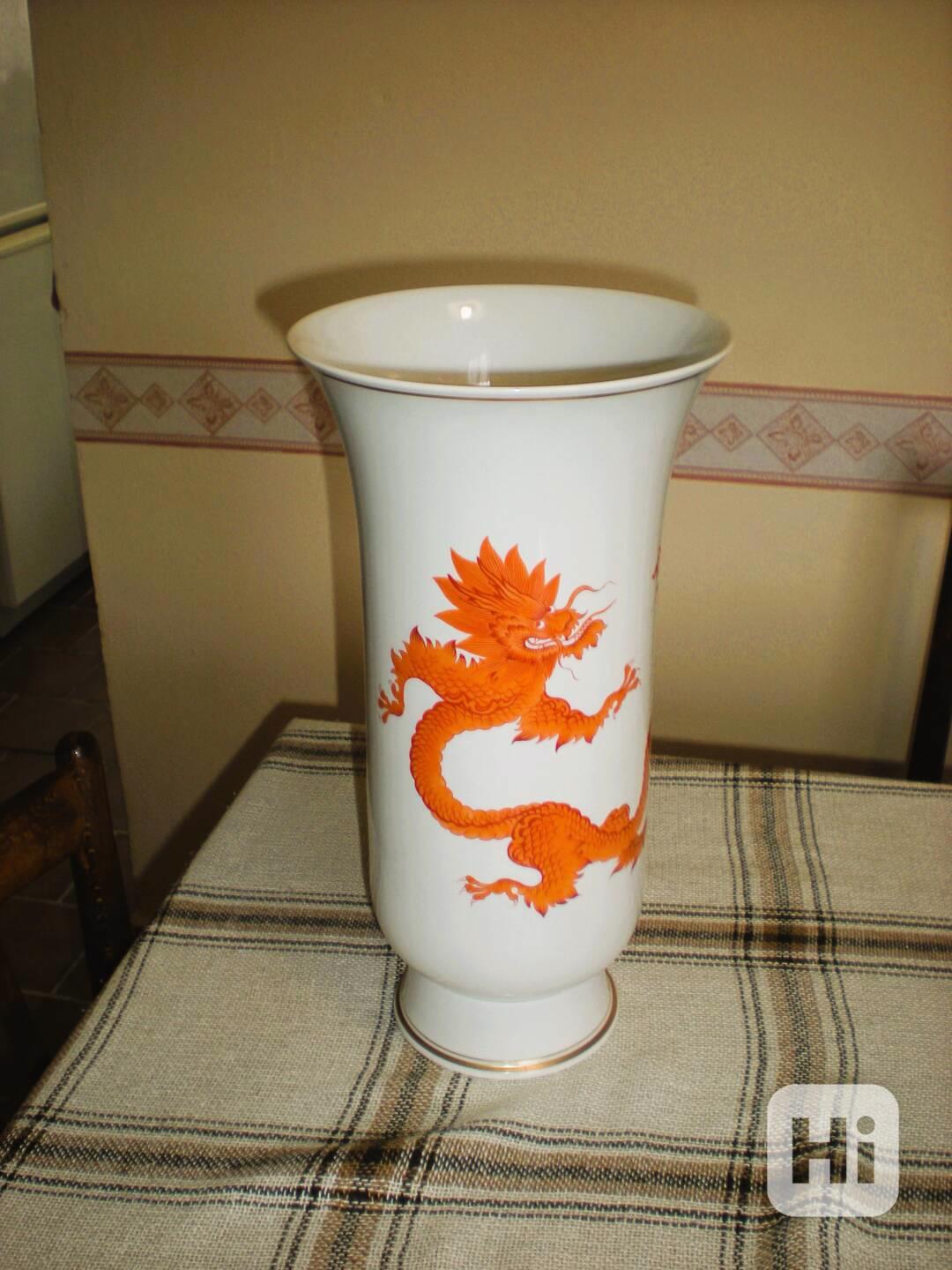Nabízím vázu míšenský porcelán s červeným drakem a horním zlatým okrajem, výška vázy 35 cm, horní průměr 18 cm,