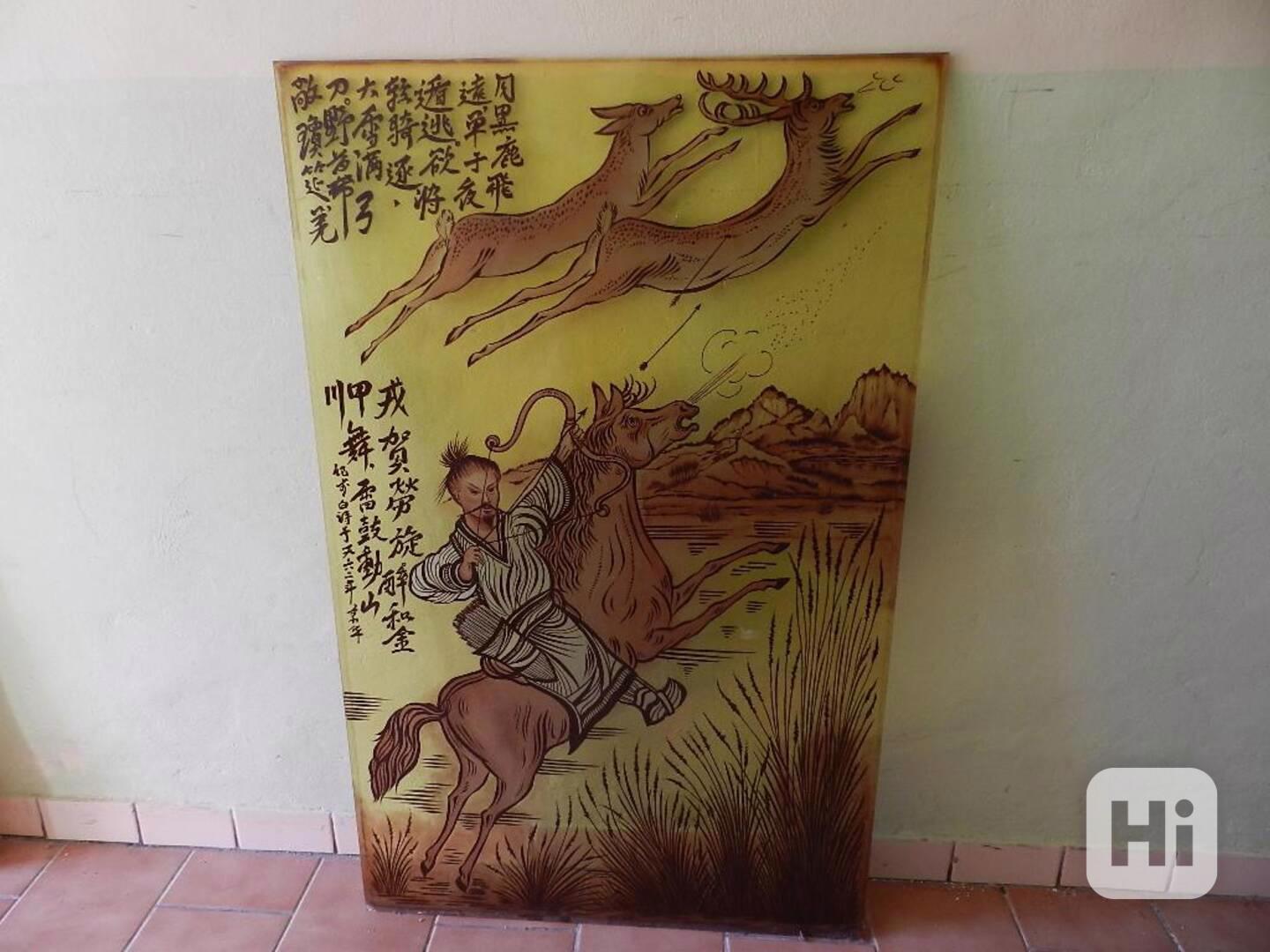 Krásné staré větší ručně malované Sklo, orientální motiv, lovecká scéna.