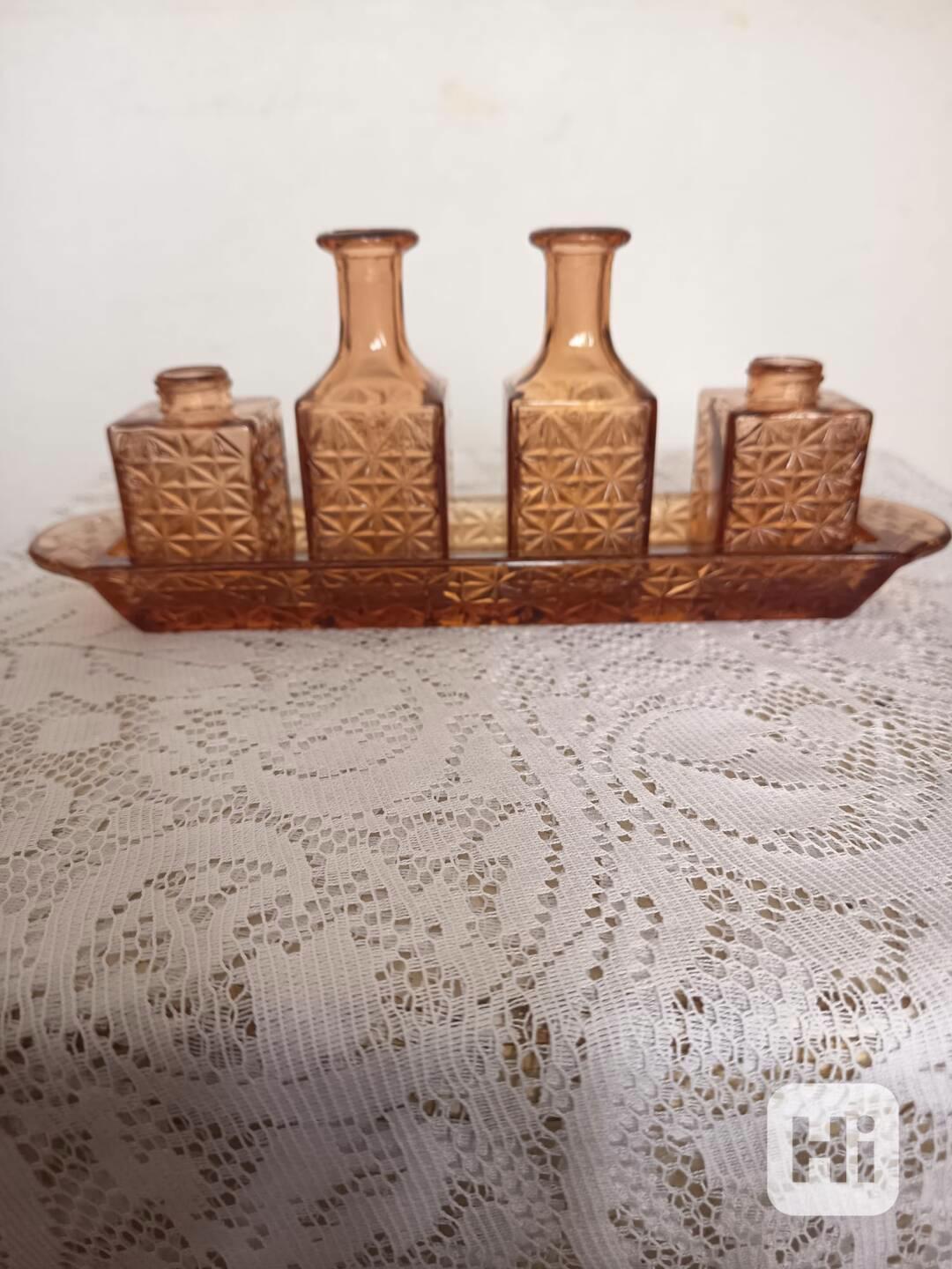 Prodám sadu krásných skleněných dóziček, 2 menší výška 5 cm, 2 větší výška 10 cm, tácek délka 26 cm