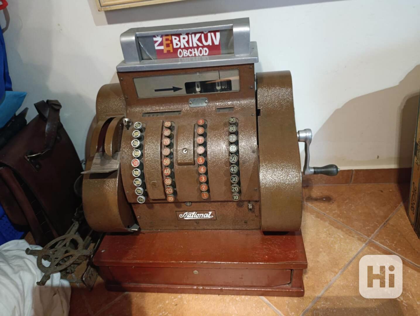 Nabízím starožitnou mechanickou pokladnu značky National (NCR), pravděpodobně z období cca 1930–1950. Jedná se o originální kus s typickým retro designem a mechanickým ovládáním pomocí kliky.