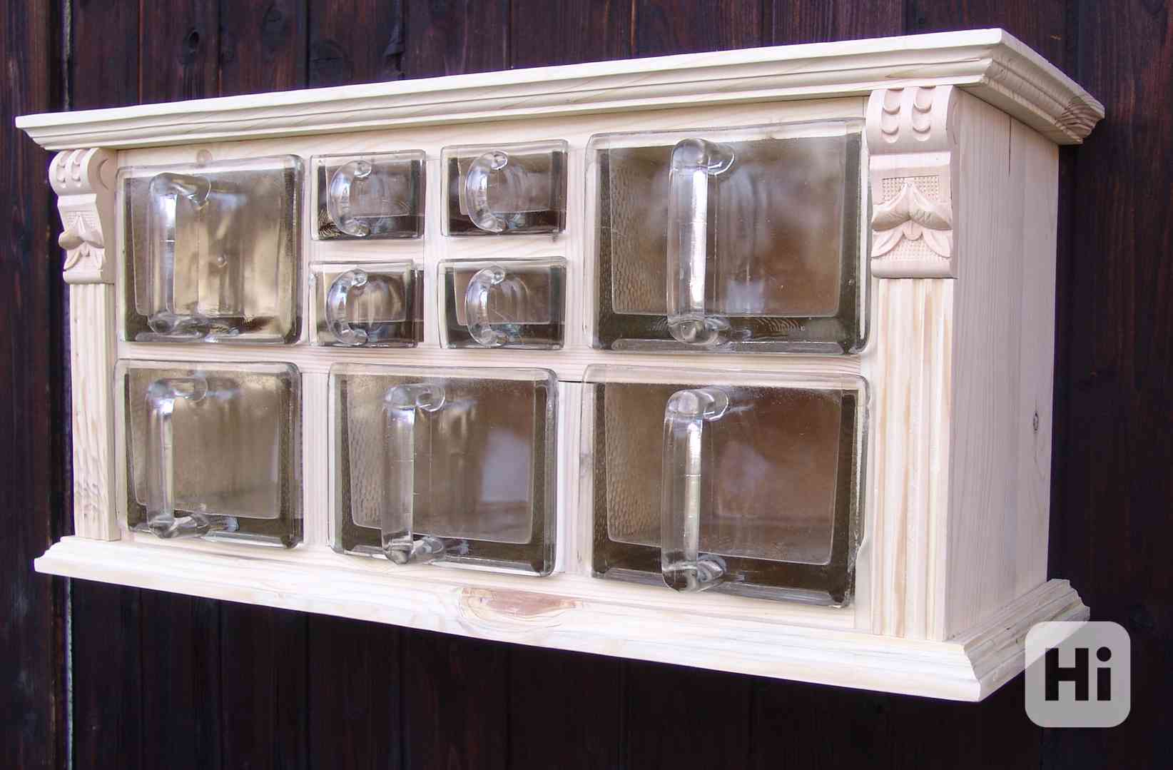 Prodám starožitné, skleněné, šuplíkové kořenky s řezbovanou poličkou bez povrchové úpravy, připravenou na finální úpravu. Jdou zavěsit na zeď, tak i jako volně stojící. Rozměry poličky 60cm x 20cm v 27,5 cm. Stav šuplíků viz. foto. V případě zájmu lze po domluvě zaslat. Cena 4 400,-Kč.