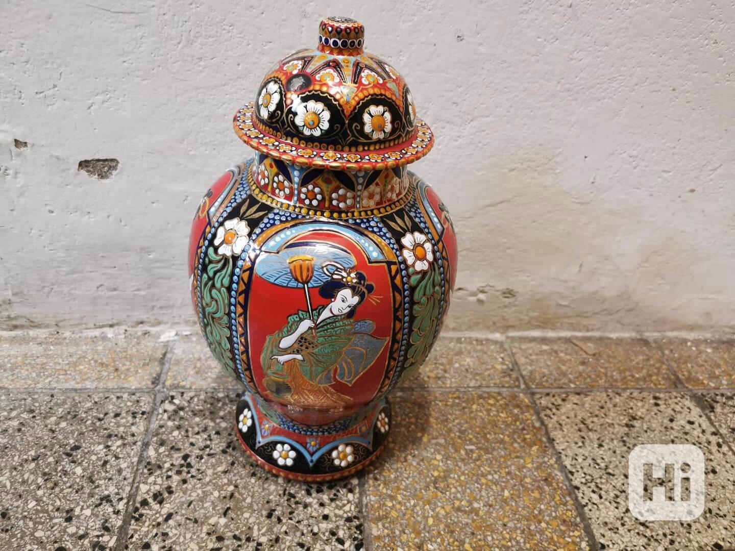 Bohatě pestře zdobená Váza s poklopem, po obvodu má čtyři různé orientální motivy žen.