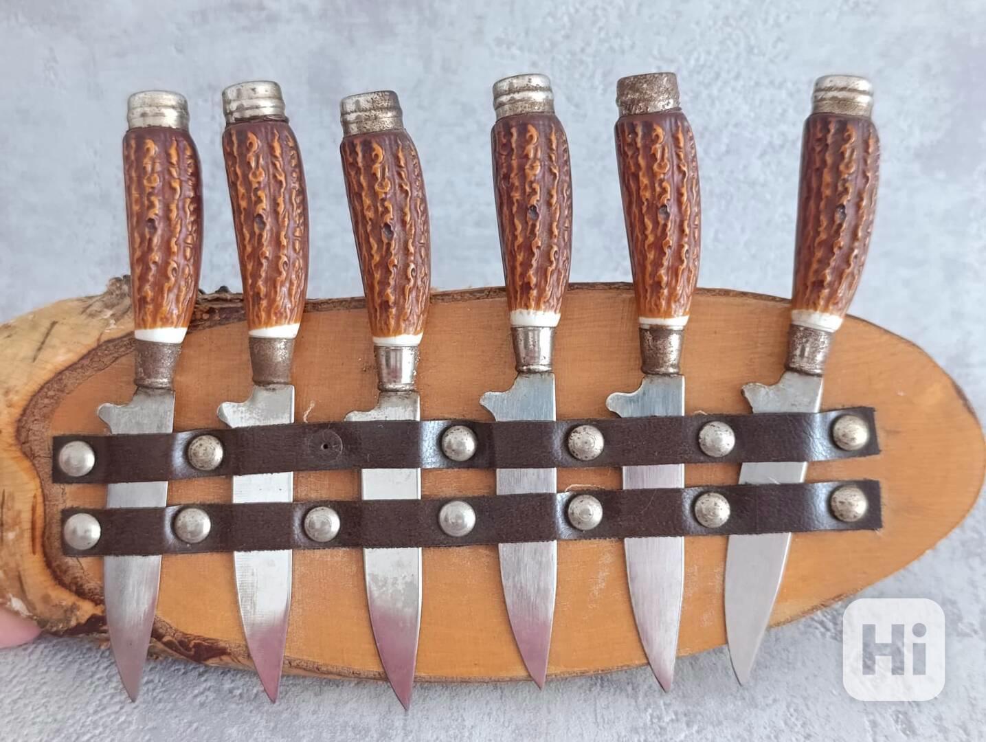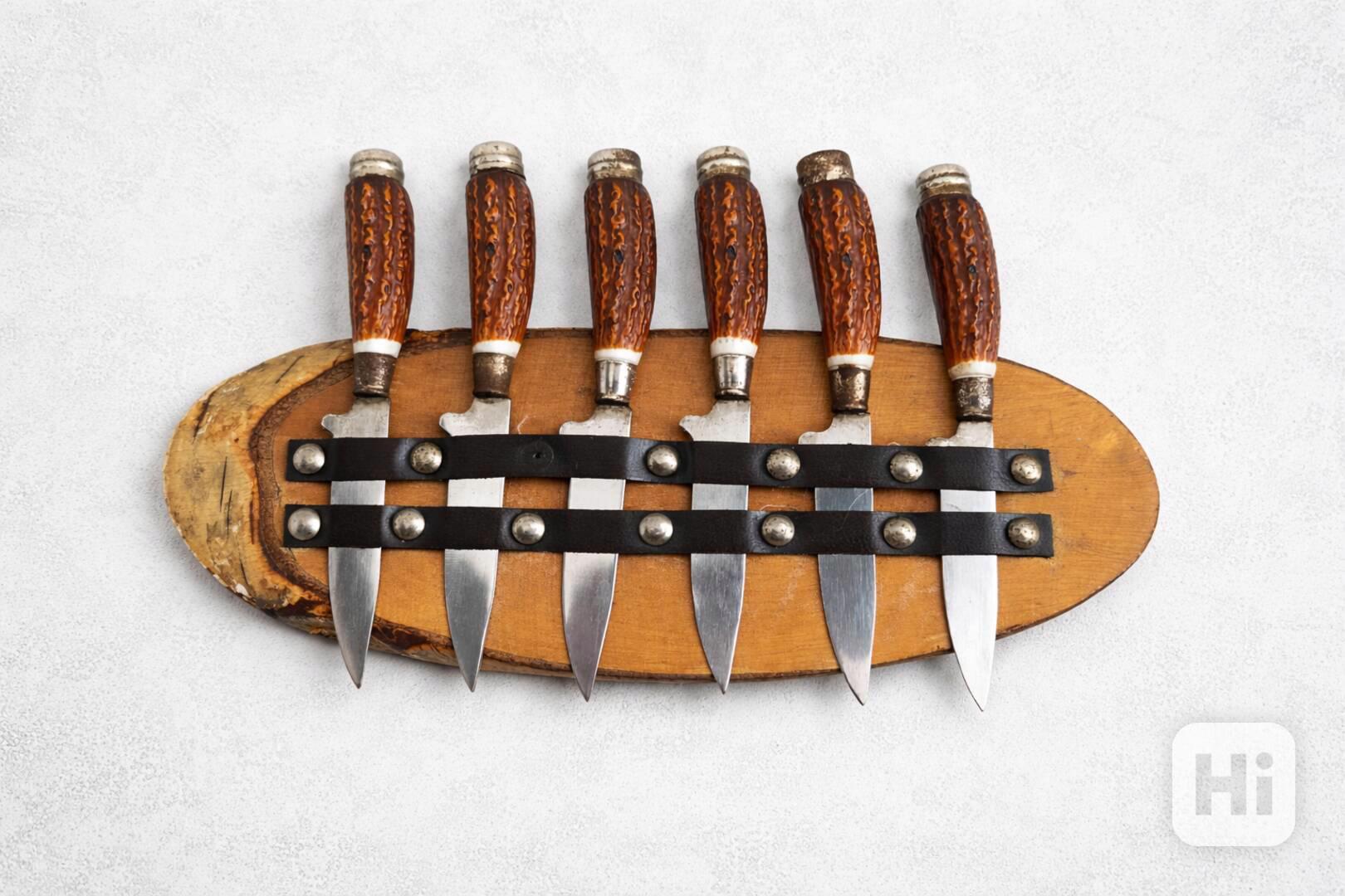 6 x malé nožíky v řadě na dřevéné podložce z břízy.