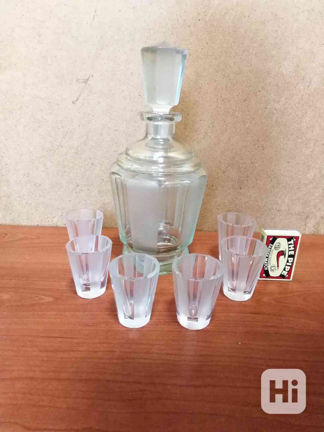 Prodám likérovou soupravu = karafa + 6 skleniček, kombinace matných a lesklých ploch, skleničky 27 x 41 mm, váha 55 gramů, objem cca 2cl, karafa výška 220 mm, průměr 70-100 mm, váha 754 gramů. Dobrý stav – neodštípané hrany. Pravděpodobně: olovnaté sklo, styl Art Deco, stáří do roku 1945. Cena 500,- Kč.