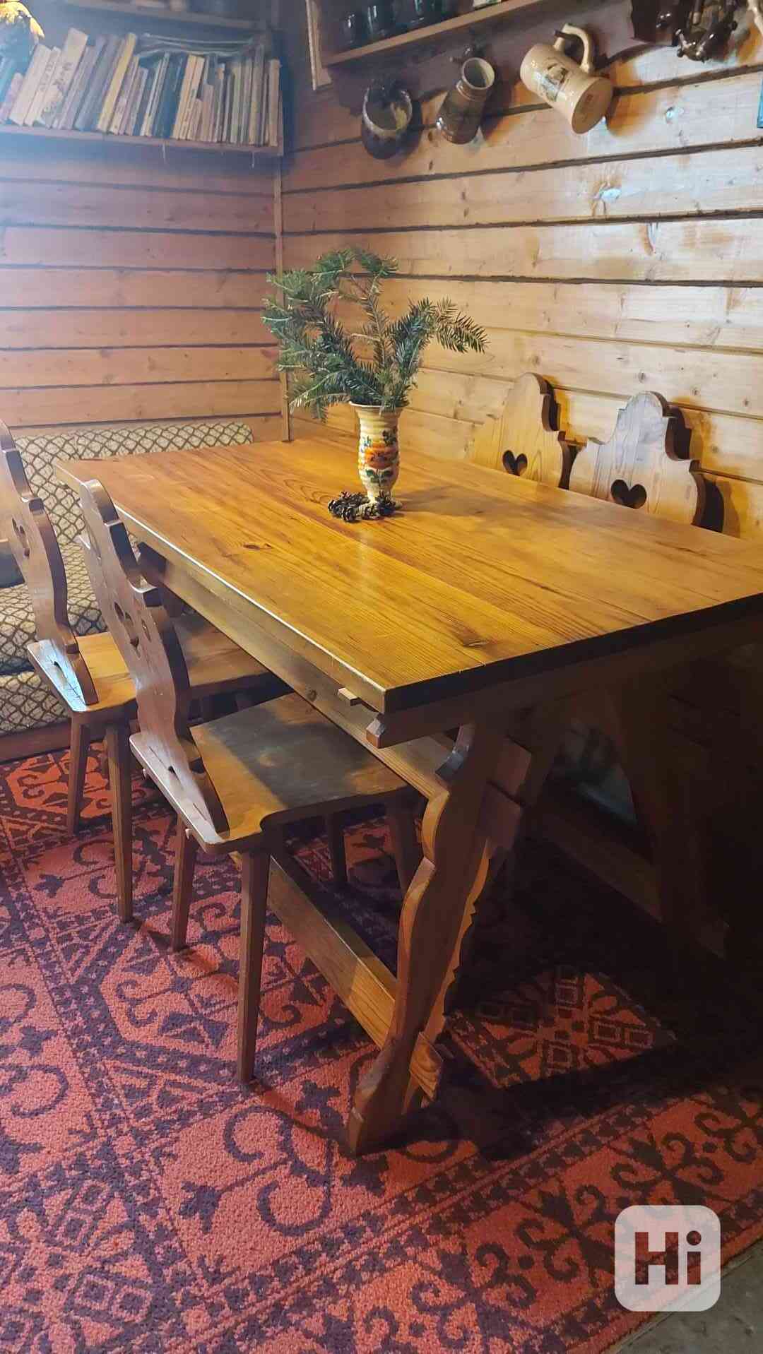 Prodám originální jídelní sestavu v tradičním valašském stylu, kterou kdysi vlastnoručně vyrobil můj dědeček. Nejde o žádnou sériovou výrobu z obchodních řetězců, ale o poctivé truhlářské řemeslo, které vydrží generace.
