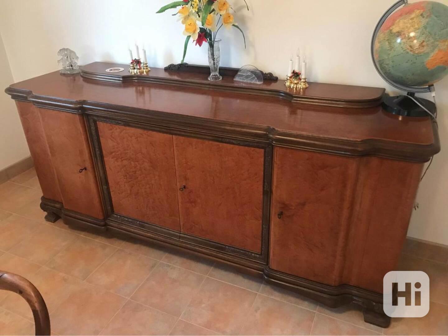 Starožitná sestava v zachovalém stavu. Komoda, rozkládací stůl + 6 židlí, vysoká komoda, konferenční stolek. Více info, fotek, video apod. na e-mailu. Děkujeme.