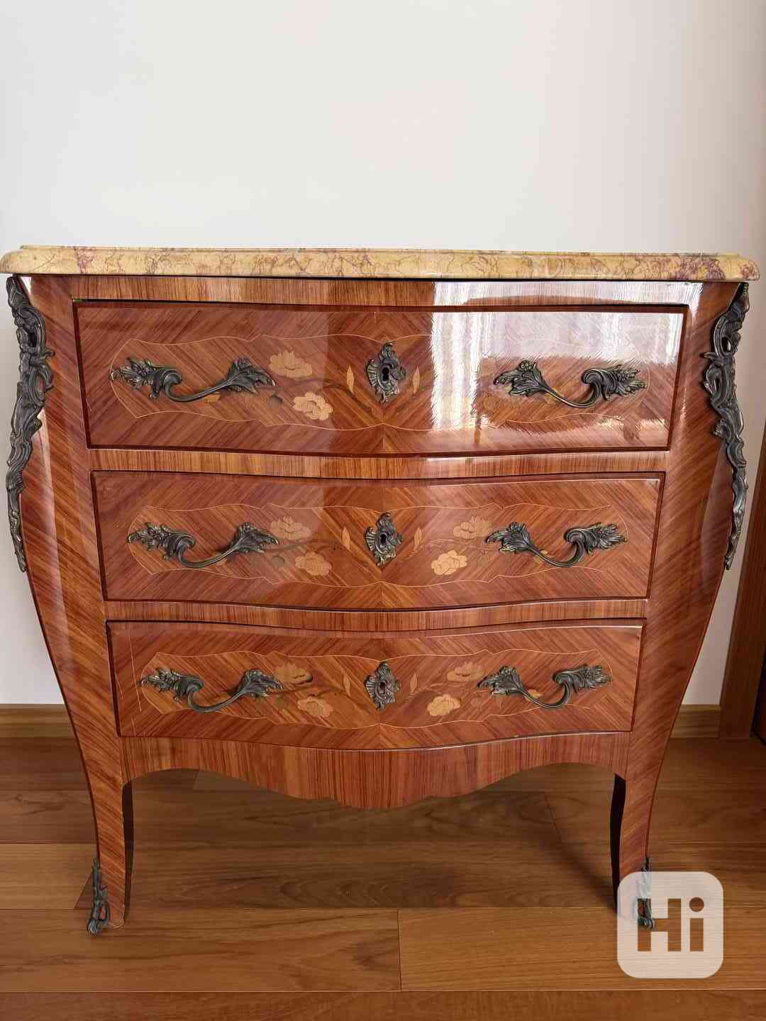 Komoda lakovaná ve stylu rokoka délka 83 cm/ šířka 45 cm/ výška 83 cm. Prodám krásnou stylovou komodu ve stylu rokoko, která zaujme svými elegantními křivkami a precizním zpracováním. Komoda je vyrobena z kvalitního dřeva s dekorativní intarzií a doplněna o výrazné kovové úchytky a ozdobné prvky.
