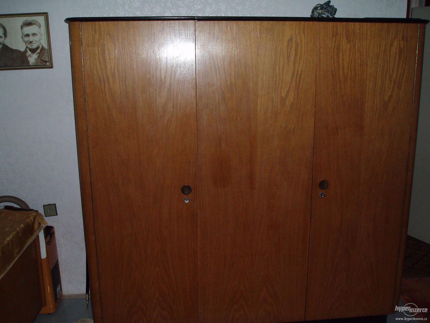 Prodám dřevěný masívní nábytek ve velmi pěkném stavu, kvalitně provedený, cca 60 let starý. Ložnice (dvoulůžko, 2 noční stolky, 2 skříně, toaletka s velkým zrcadlem), a obývací pokoj (rozkládací stůl, 4 židle, knihovna, sekretář, rozkládací sedačka). I jednotlivě.