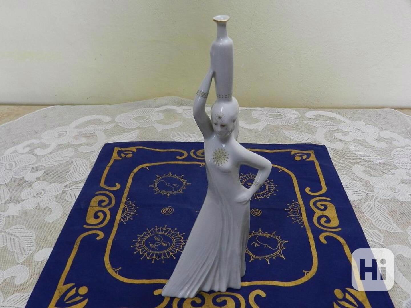 Větší zlacená porcelánová Plastika, stojící dívka s amforou na hlavě - Studio Lesov Karlovarský Porcelán, kolem 70 a 80 let 20 stol.
