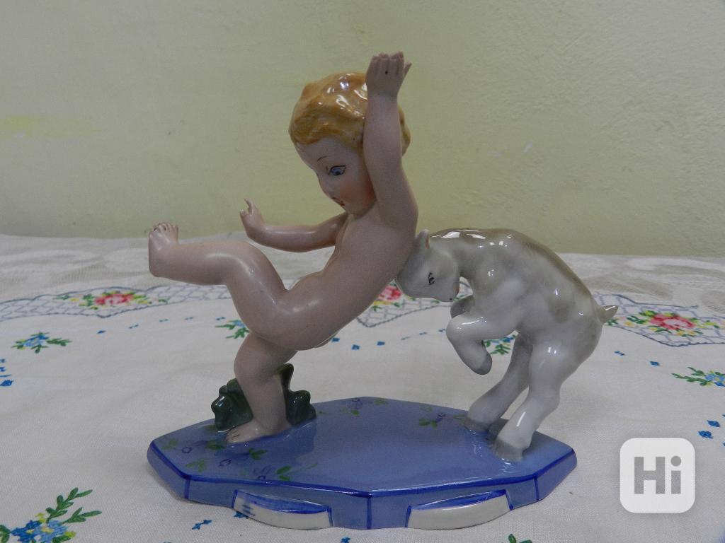 Chlapec a Kozlík - Royal Dux Czechoslovakia, 1 pol. 20 stol.Rozměry: výška 13,5cm, délka 16-6,5cm.