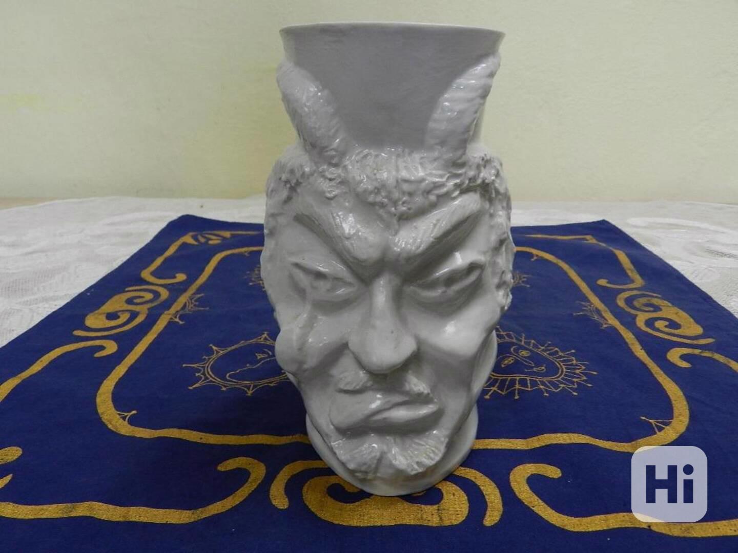 Zajímavý starý figurální porcelánový korbel ve tvaru čerta.