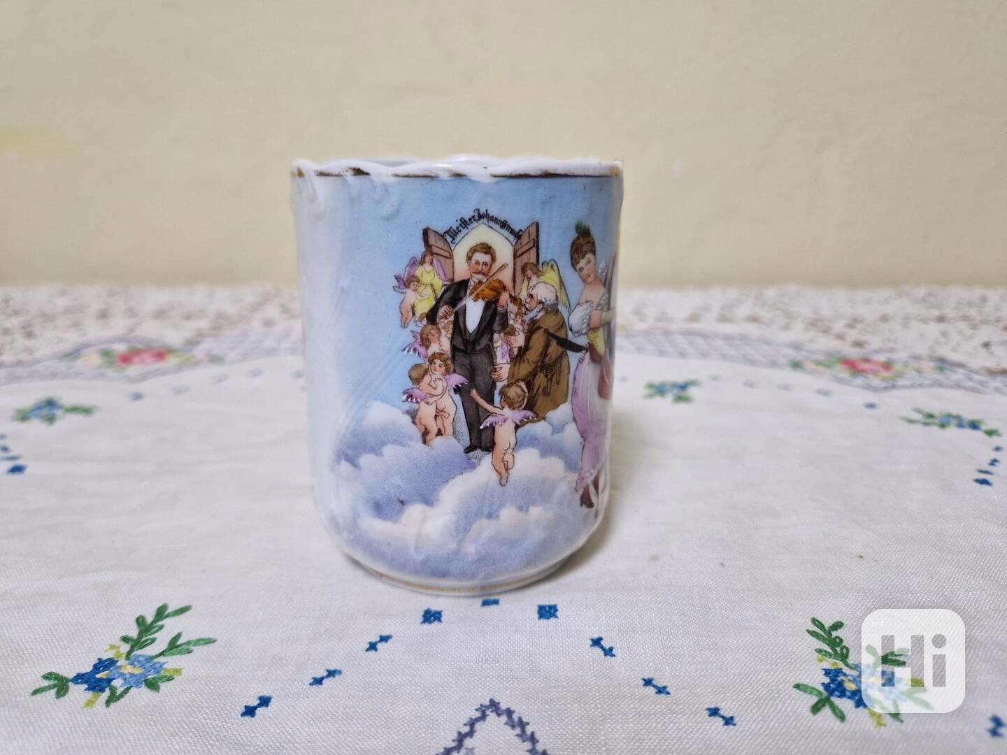 Vzácný ručně malovaný Hrnek, Johann Strauss mladší, svatební? Čechy nebo Rakousko, poslední třetina 19 stol.