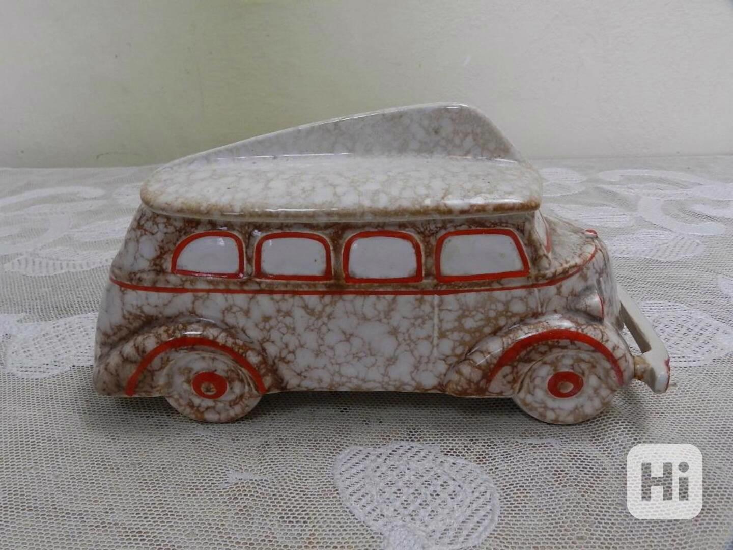 Nevídaná Art Deco větší keramická dóza ve tvaru automobilu, - značeno na spodní části číslem 2123, Ditmar Urbach, 1 pol. 20 stol.