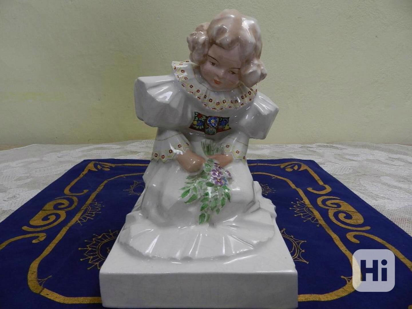 Hezká ručně malovaná keramická Soška, Dívka s Květinami - Bechyně, 1 pol. 20 stol.