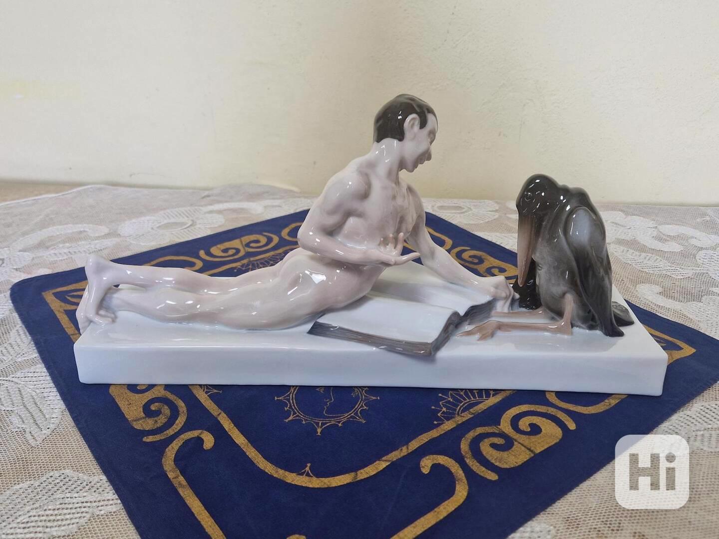 Velmi vzácná větší porcelánová socha, Filosofická disputace s marabu, limitovaná série, 92 kus z celkově vyrobených 200 kusů exemplářů! Signováno, značeno - Ferdinand Liebermann, Rosenthal Německo, 1920.