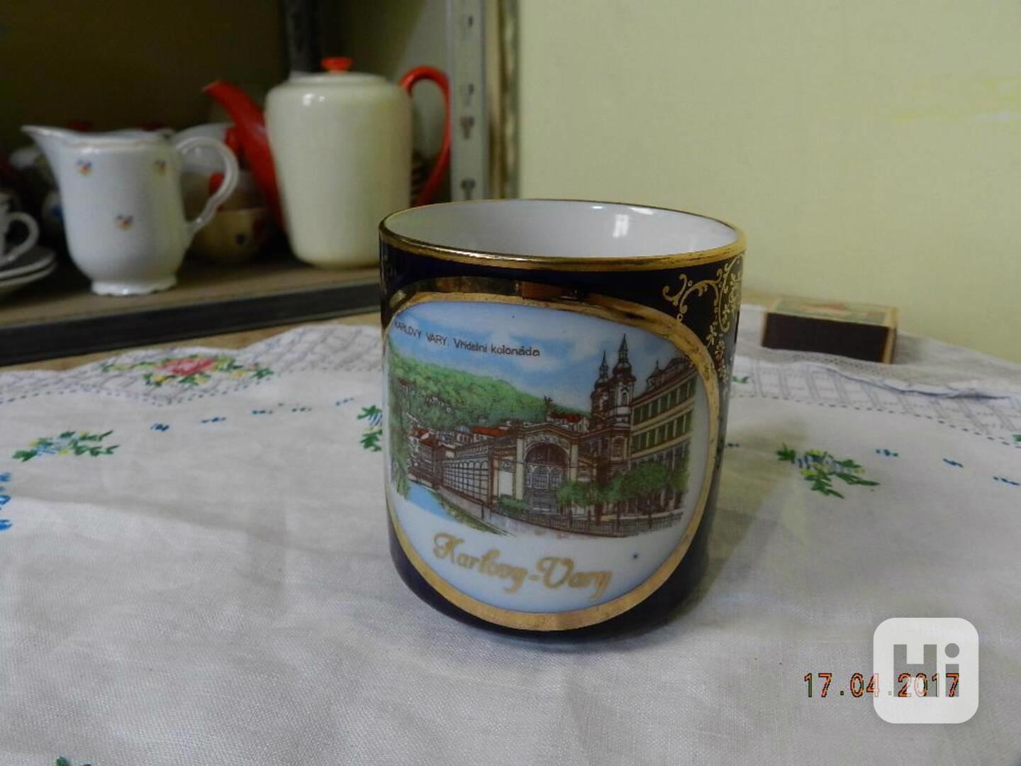 Krásný starý secesní kobaltový hrnek - Karlovy Vary Vřídelní Kolonáda.Rozměry: výška 8,5cm, průměr 7,5cm, šířka 10cm, hmotnost 150g.