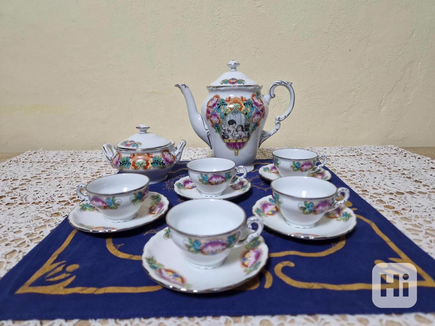 Luxusní kávový servis pro 5 osob, precizní ruční malba - vše značeno, Jihočeské malovánky, V. podhrázský, 1940.