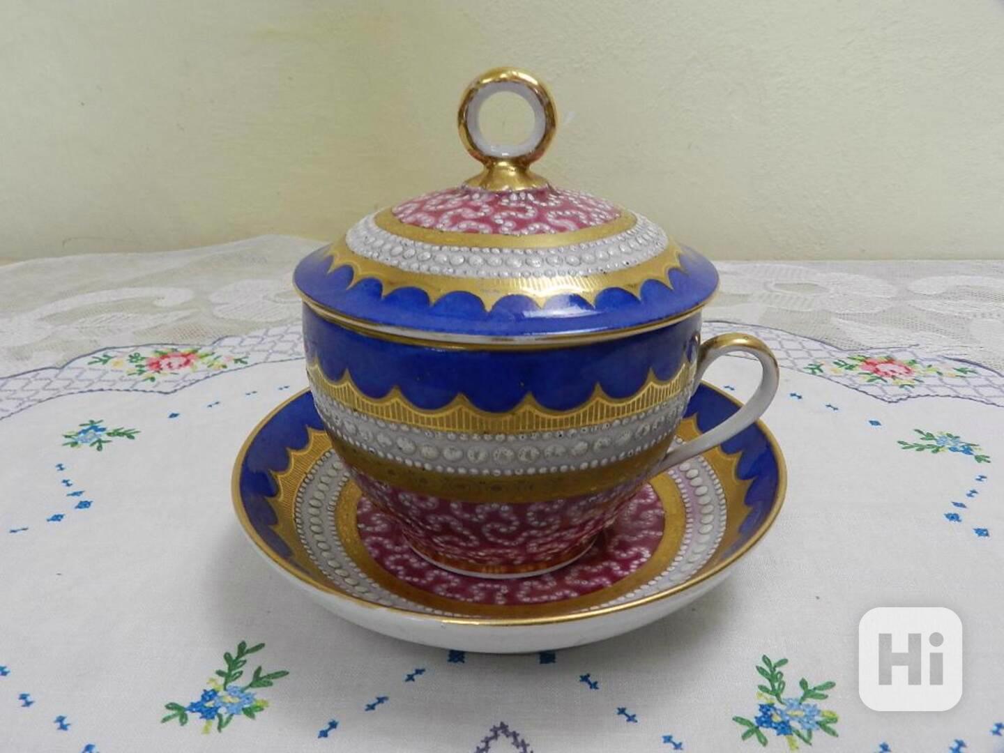 Zajímavý větší ručně zdobený zlacený Hrnek na bujón či čokoládu, Biedermeier, 1 pol.19 stol.