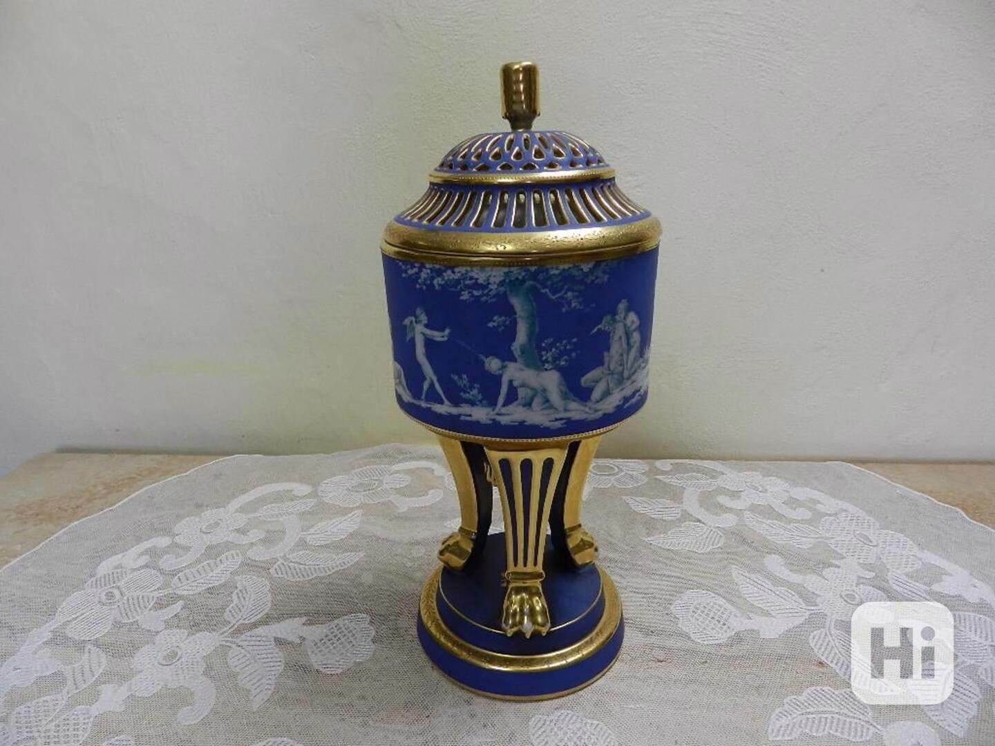 Luxusní masivní empírová Váza s poklopem na třech nožičkách, silně bohatě zlaceno, po celém obvodu krásná ruční malba, antické mytologické motivy, celkem 12 postav, - značka šlechtického rodu Harrach, porcelánka Loket, koncern Epiag, Czechoslovakia, 1 třetina 20 stol.