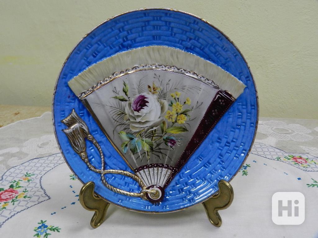 Modrý malovaný dekorační Talíř Vějíř reliéf Značeno 19st